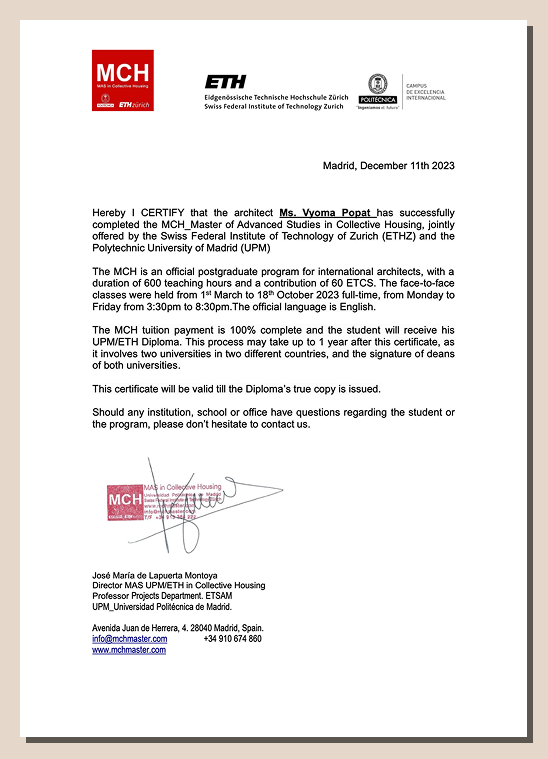 ability to balance functionality with aesthetic excellence. - Global Education – Completed the Master of Advanced Studies in Collective Housing (MCH) in 2023, jointly offered by